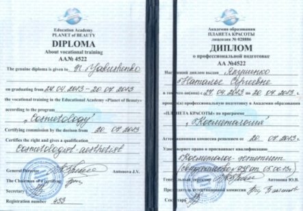 - Постоянное повышение квалификации: посещение выставок индустрии красоты, участие в семинарах по передовым технологиям и новинкам косметологии, изучение опыта ведущих косметологов России и мира